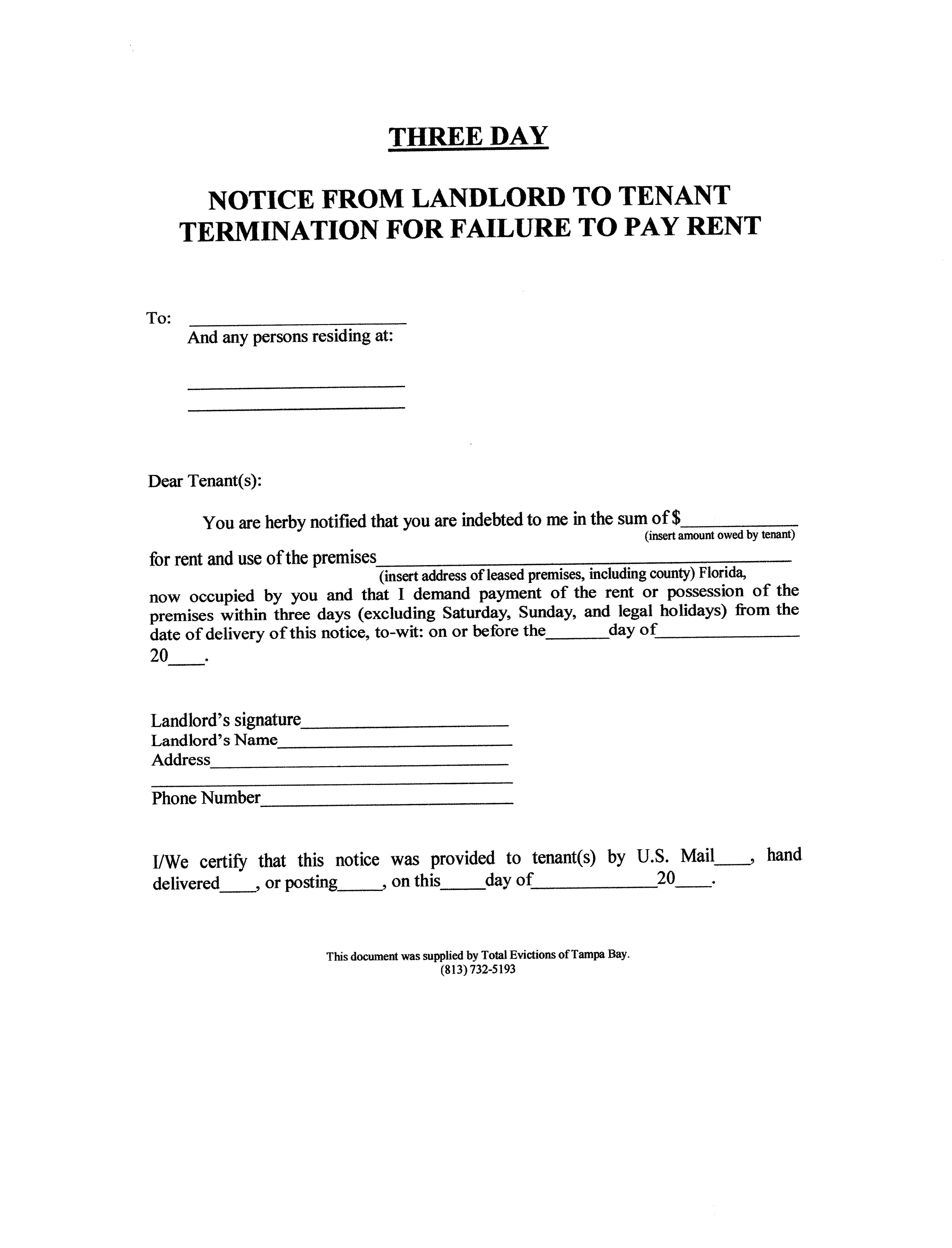 VERY IMPORTANT: DO NOT count the day you delivered the notice and give the tenant 3 FULL DAYS. Example: If you deliver the notice on Wednesday, the 21st, the tenant gets Thursday, Friday and Monday and the demand payment day is Monday, the 26th, provided there are NO holidays (check court observed holidays). Three Day Notice (SAMPLE)
